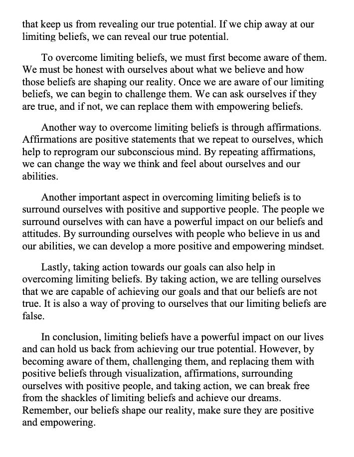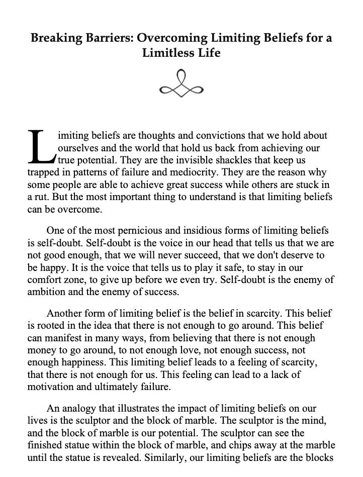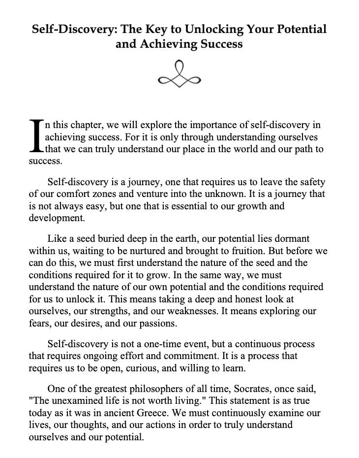 The AI has synthesized centuries of human wisdom into a succinct guide, offering readers the chance to delve into the depths of their inner-self and uncover hidden potential. With minimal editing, the original text generated by the AI has been preserved, providing a unique glimpse into the current state of AI technology. The book answers the questions that all humans ask themselves: How can I achieve happiness? How can I become wealthy? How can I be successful? The Book of Infinite Wisdom will guide you on the path toward achieving your goals, with practical, actionable advice that can be applied to all areas of life. The book is not just a reading experience, but a thought-provoking intellectual journey, where you'll discover the power of human knowledge and cutting-edge AI technology. Get your hands on The Book of Infinite Wisdom today and open the doors to your unlimited potential.